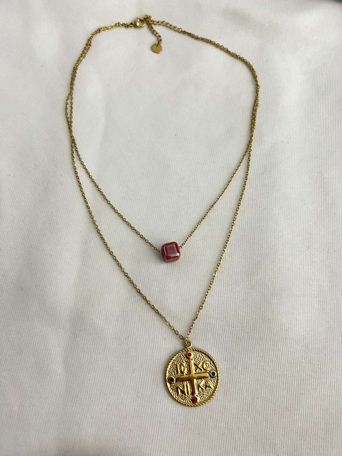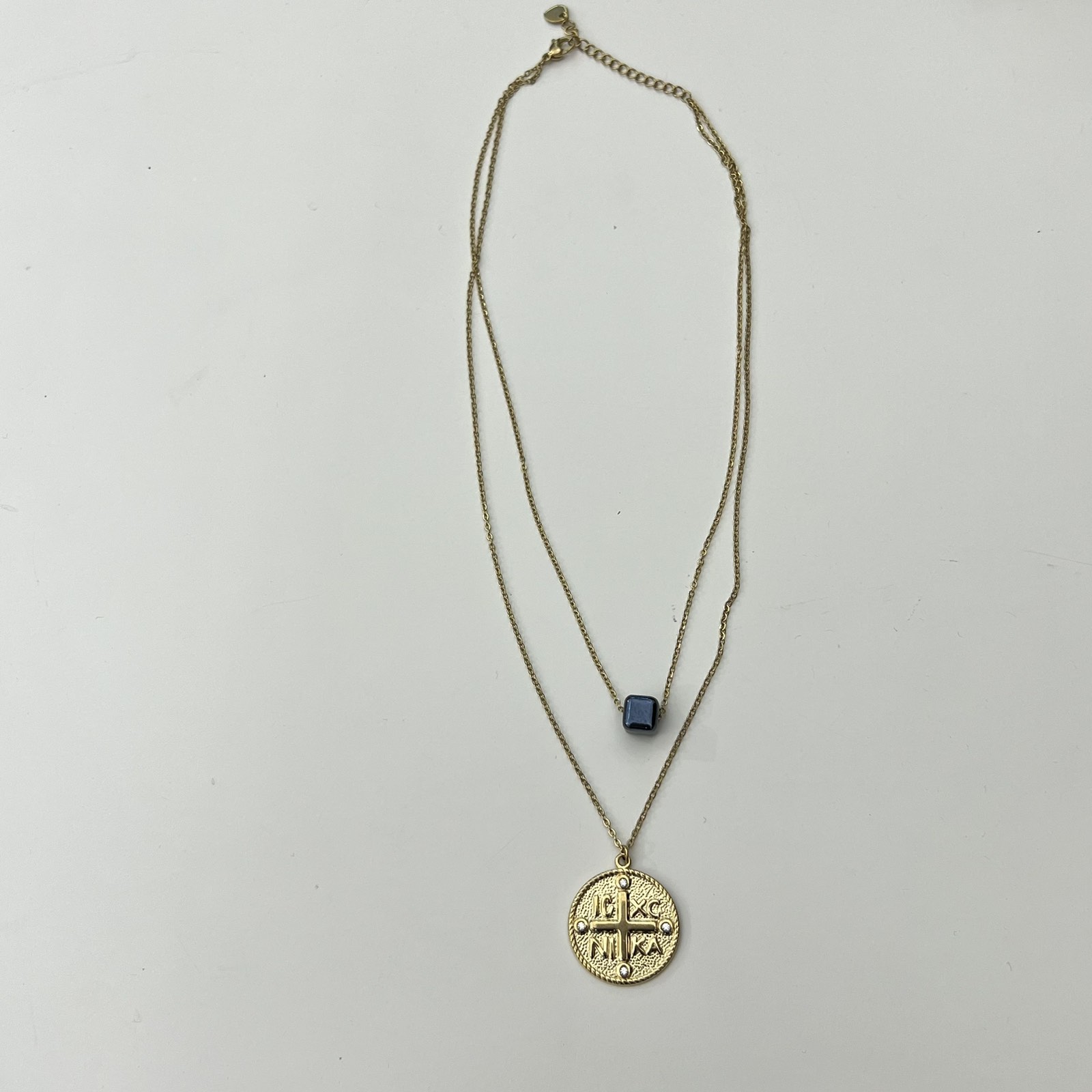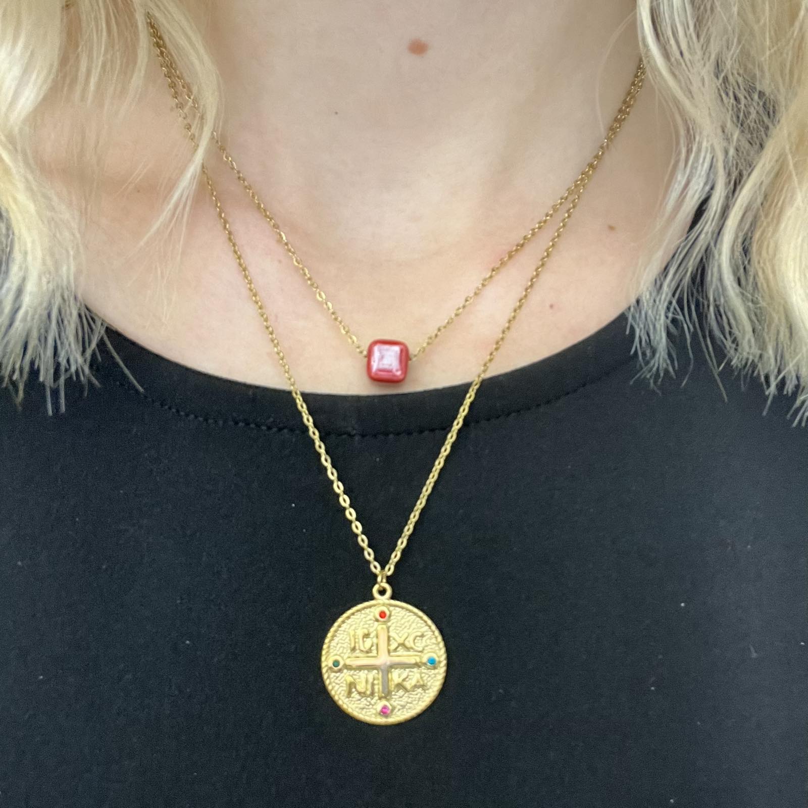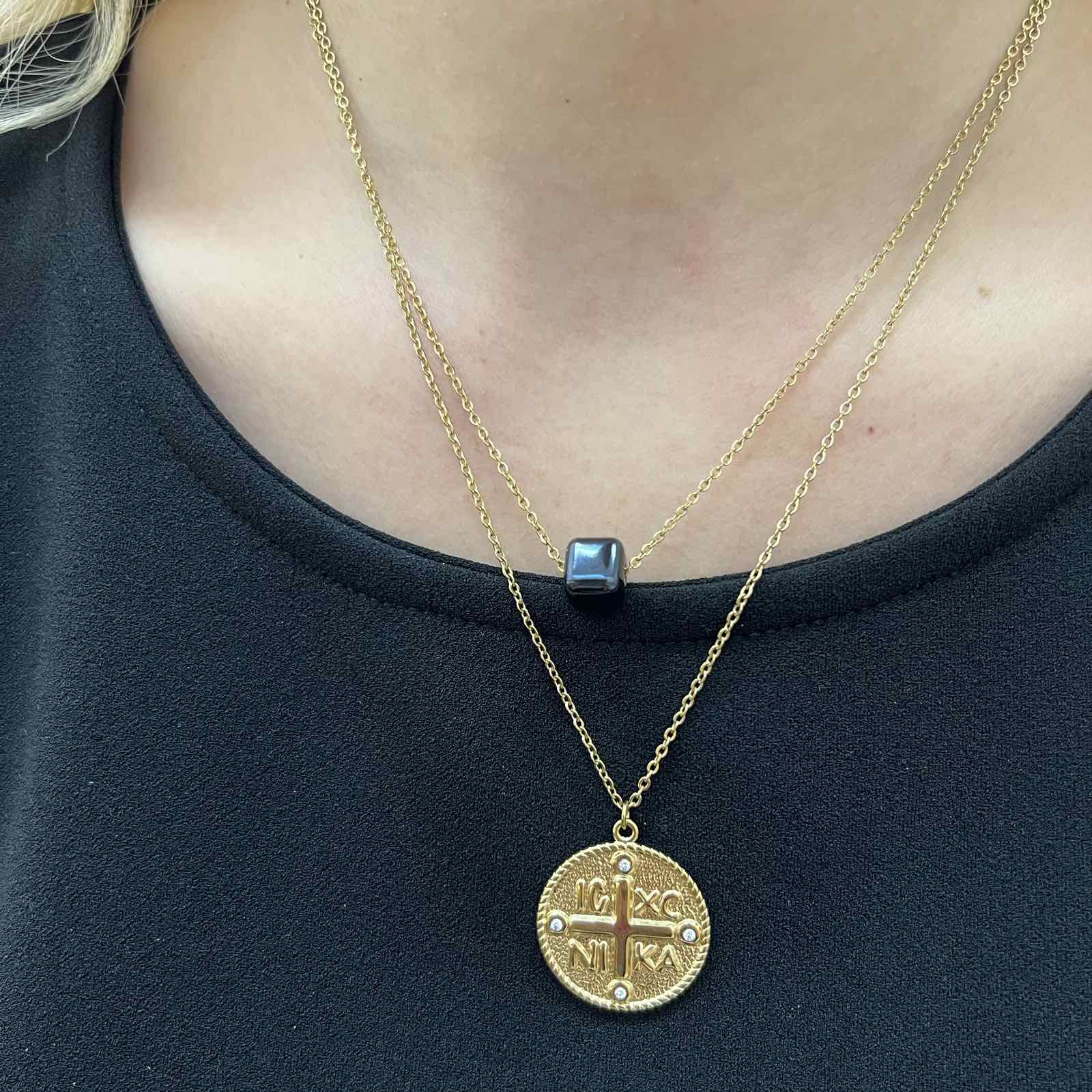 Προσθέτουμε μια διαχρονική πινελιά πίστης και κομψότητας στη συλλογή σας με αυτή την ατσάλινη αλυσίδα Κωνσταντινάτο με πέτρα σε χρυσή απόχρωση.