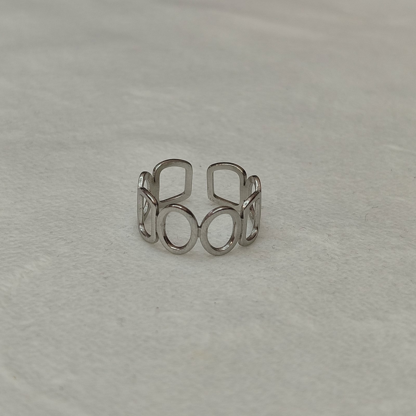Απογείωσε το στυλ σου με αυτό το ατσάλινο δαχτυλίδι με γεωμετρικά σχήματα σε ασημί απόχρωση.