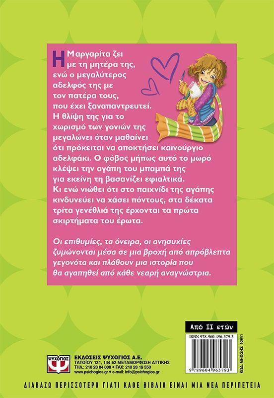 Η Μαργαρίτα ζει με τη μητέρα της, ενώ ο μεγαλύτερος αδελφός της με τον πατέρα τους, που έχει ξαναπαντρευτεί. Η θλίψη της για το χωρισμό των γονιών της μεγαλώνει όταν μαθαίνει ότι πρόκειται ν’ αποκτήσει καινούργιο αδελφάκι. Ο φόβος μήπως αυτό το μωρό κλέψει την αγάπη του μπαμπά της για εκείνη τη βασανίζει εφιαλτικά. Κι ενώ νιώθει ότι στο παιχνίδι της αγάπης κινδυνεύει να χάσει πόντους, στα δέκατα τρίτα γενέθλιά της έρχονται τα πρώτα σκιρτήματα του έρωτα. Οι επιθυμίες, τα όνειρα, οι ανησυχίες ζυμώνονται μέσα σε μια βροχή από απρόβλεπτα γεγονότα και πλάθουν μια ιστορία που θα αγαπηθεί από κάθε νεαρή αναγνώστρια.