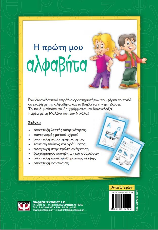 Ένα διασκεδαστικό τετράδιο δραστηριοτήτων που φέρνει το παιδί σε επαφή με την αλφαβήτα και το βοηθά να την εμπεδώσει. Το παιδί μαθαίνει τα 24 γράμματα και διασκεδάζει παρέα με τη Μαλένα και τον Νικόλα! Στόχοι: · ανάπτυξη λεπτής κινητικότητας · συντονισμός ματιού-χεριού · ανάπτυξη παρατηρητικότητας · ταύτιση εικόνας και γράμματος · εισαγωγή στην πρώτη ανάγνωση · διαχωρισμός φωνηέντων και συμφώνων · ανάπτυξη λογικομαθηματικής σκέψης · ανάπτυξη φαντασίας