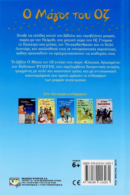 Άνοιξε τις σελίδες αυτού του βιβλίου και στροβιλίσου µακριά, παρέα µε την Ντόροθι, στη µαγική χώρα του Οζ. Γνώρισε το Σκιάχτρο που µιλάει, τον Τενεκεδάνθρωπο και το δειλό Λιοντάρι, και ακολούθησέ τους σε συναρπαστικές περιπέτειες, καθώς προσπαθούν να πραγµατοποιήσουν τις επιθυµίες τους. Το βιβλίο Ο Μάγος του Οζ ανήκει στη σειρά «Κλασικά Αγαπηµένα» των Εκδόσεων ΨΥΧΟΓΙΟΣ, που περιλαµβάνει διαχρονικές ιστορίες, γραµµένες µε απλό και κατανοητό τρόπο, και µε εντυπωσιακή εικονογράφηση που κρατά αµείωτο το ενδιαφέρον των µικρών αναγνωστών.