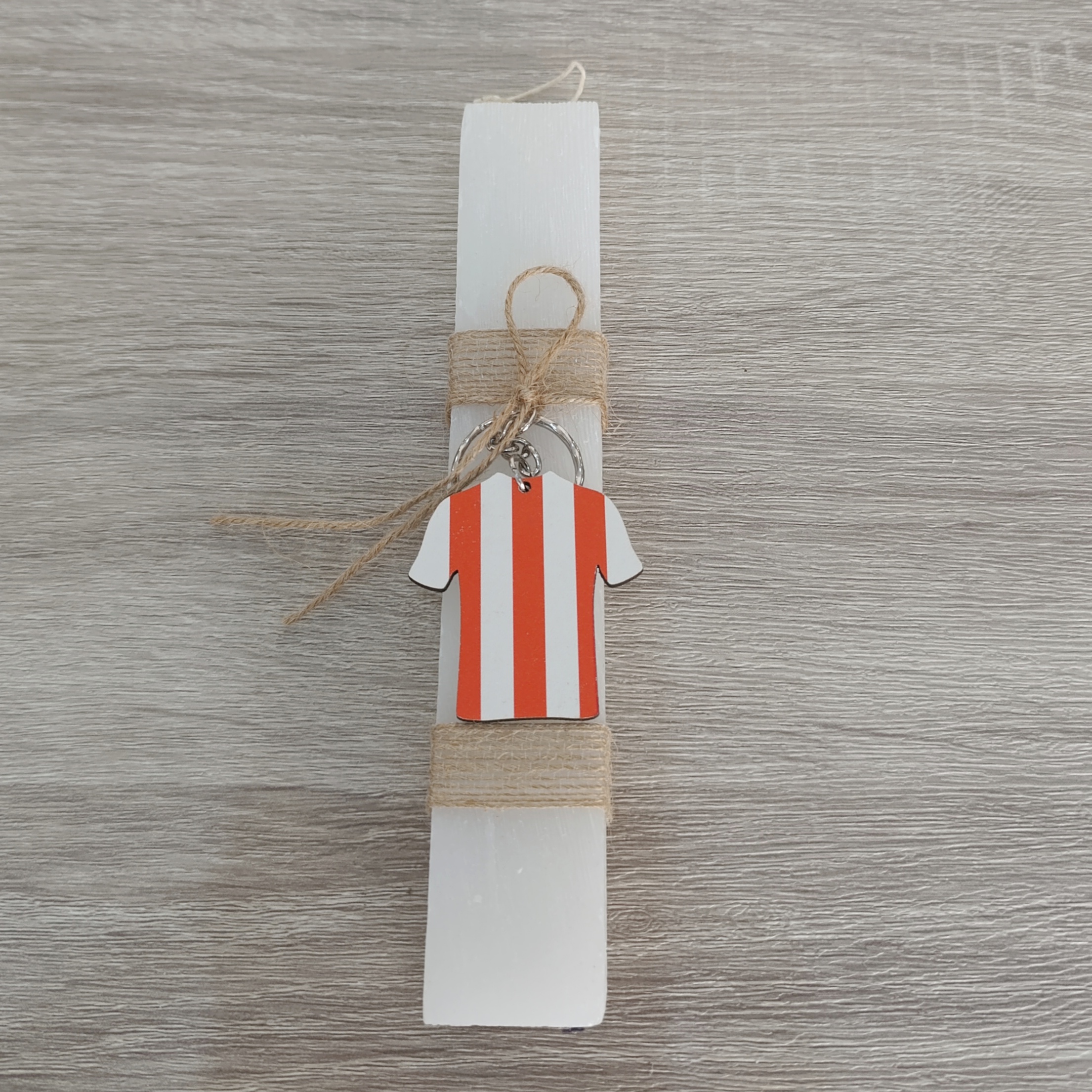 λαμπάδα ανδρική αρωματική λευκή με μπρελόκ ξύλινη φανέλα ολυμπιακός