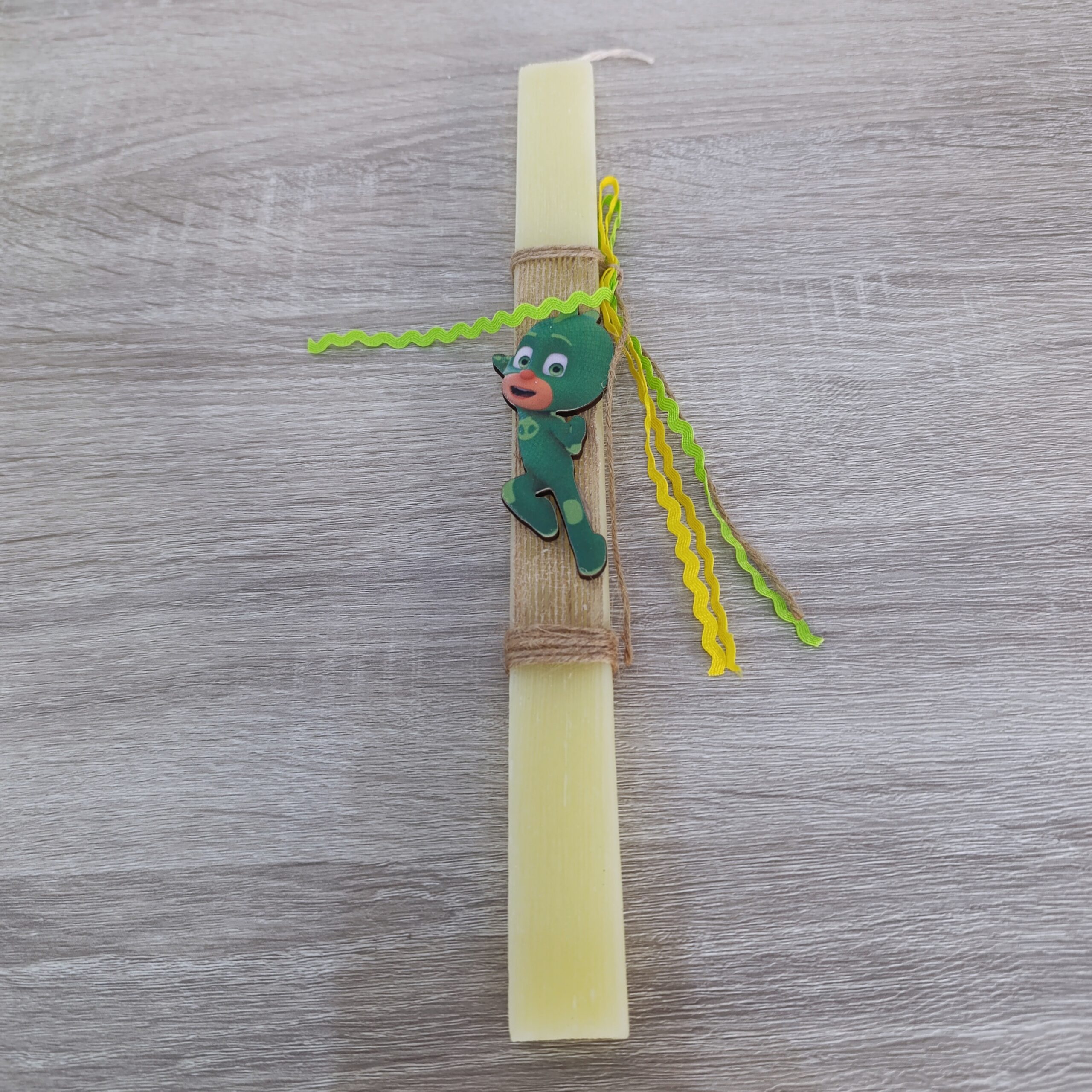 Λαμπάδα αρωματική παιδική με ξύλινη διακοσμητική φιγούρα Γκέκο Πιτζαμοήρωες