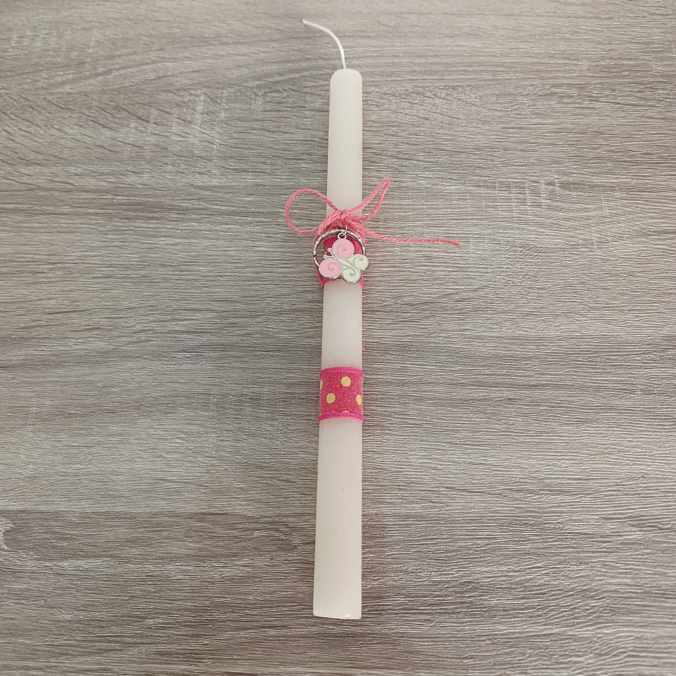 λαμπάδα κύλινδρος με μεταλλικό μπρελόκ ρόζ πεταλούδα