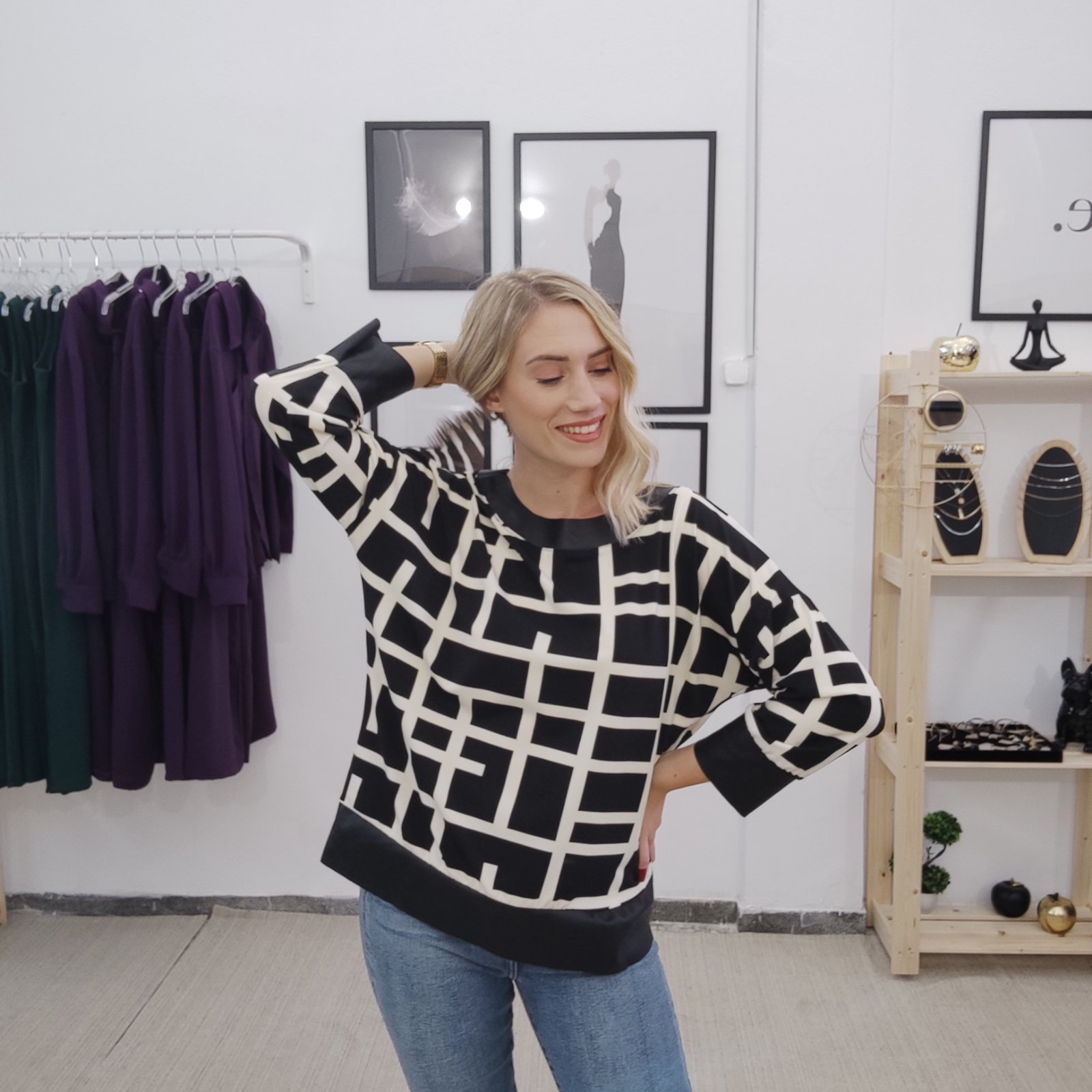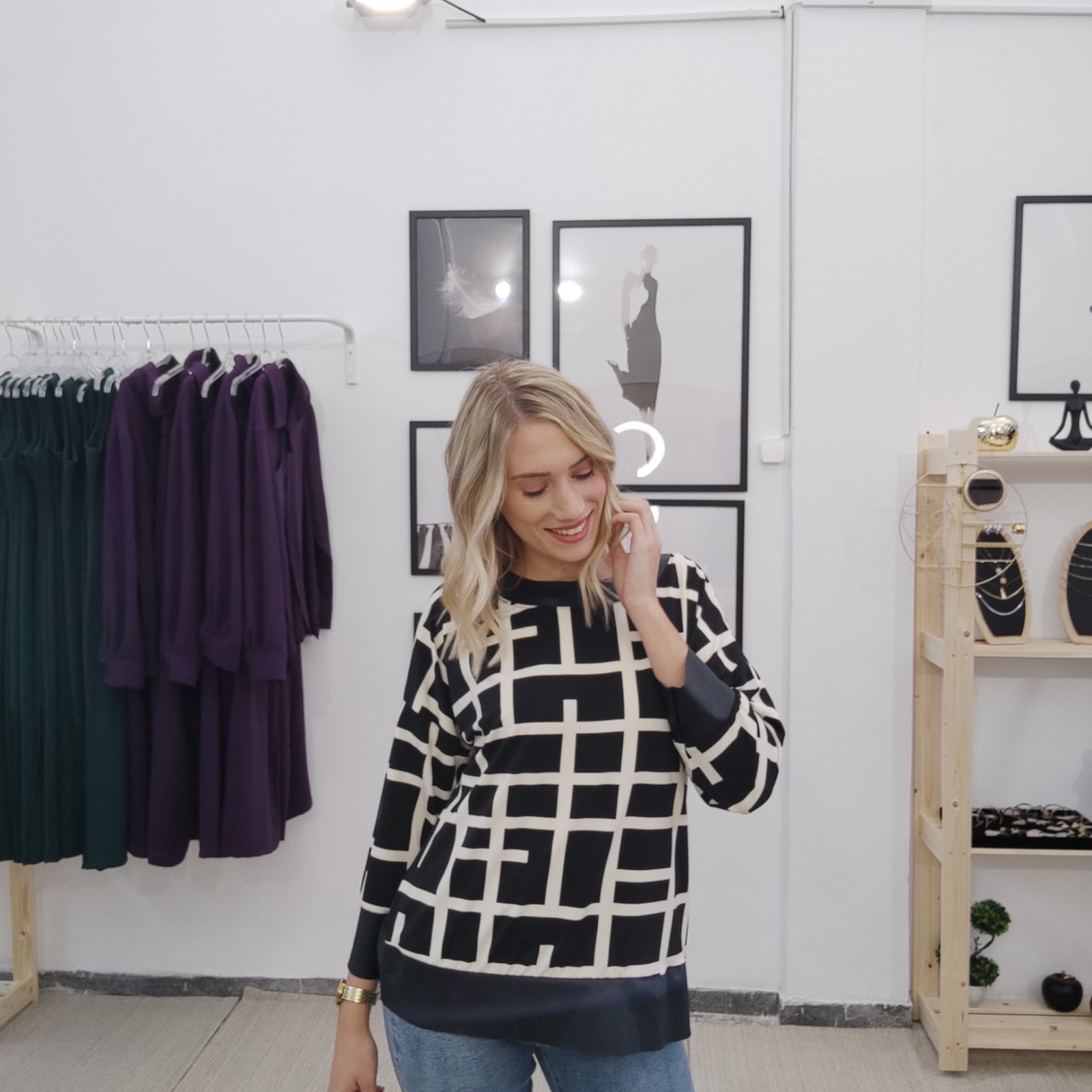 Η ασπρόμαυρη μπλούζα με σχέδια και λεπτομέρειες προσφέρει έναν μοντέρνο και εντυπωσιακό συνδυασμό.