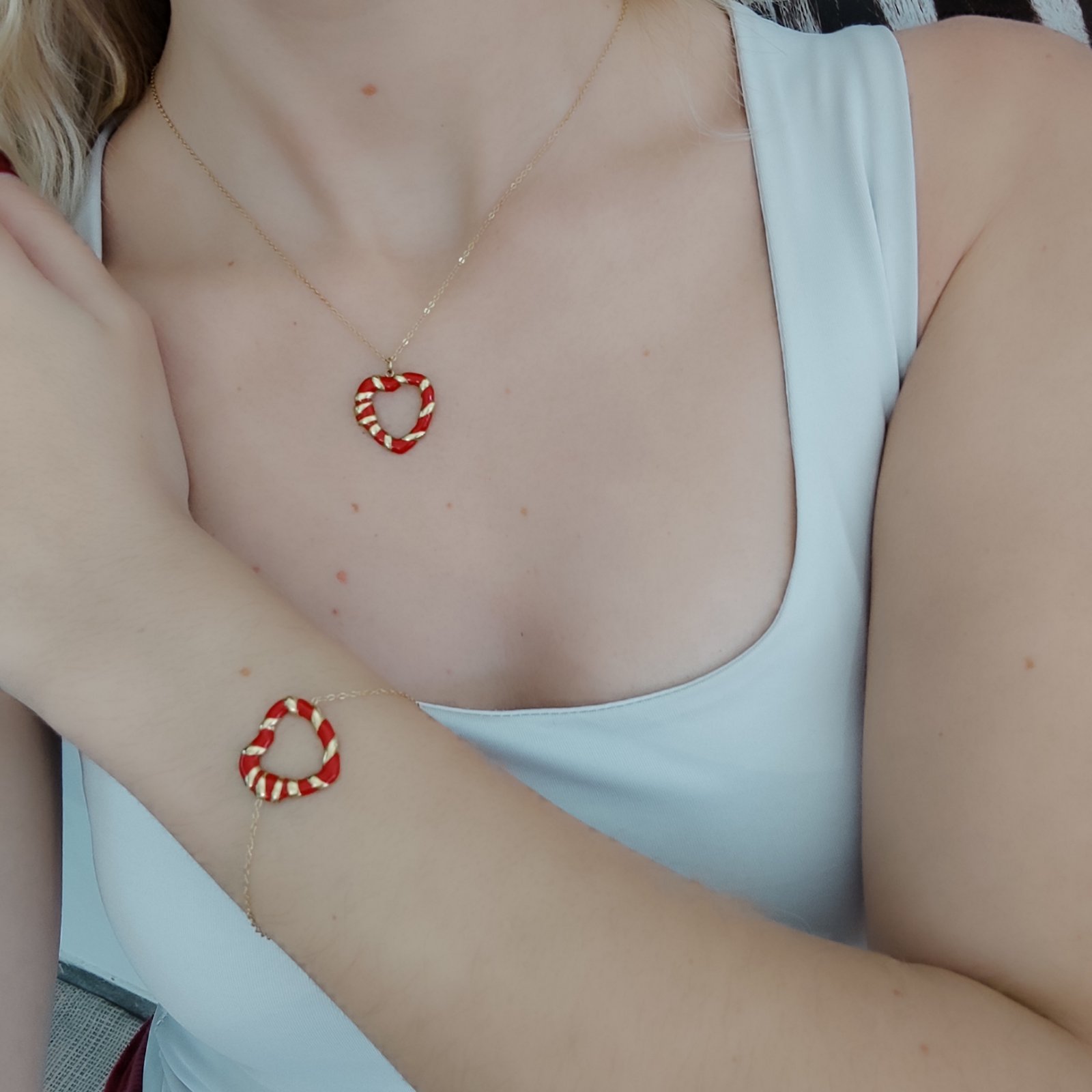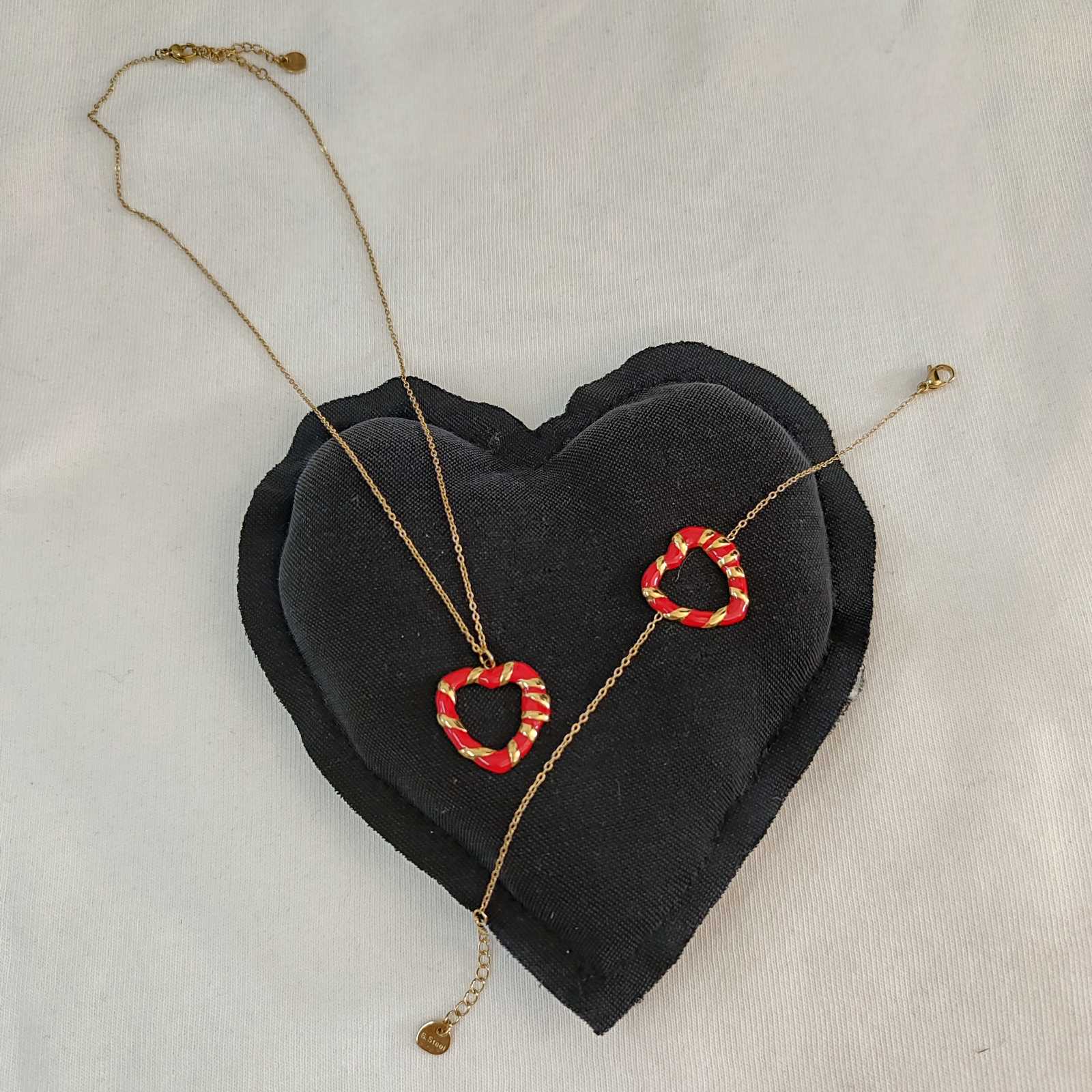 Ατσάλινο set αλυσίδα-βραχιόλι κόκκινη καρδιά με χρυσές λεπτομέρειες. Δεν προκαλούν αλλεργίες και δεν μαυρίζουν.