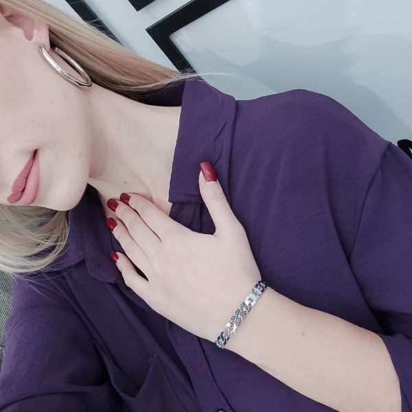 Η χειροπέδα στολίζει τον καρπό με διακριτική πολυτέλεια, χάρη στα λαμπερά strass που αντανακλούν το φως. Τα σκουλαρίκια κρίκοι ολοκληρώνουν το look με απλότητα και κομψότητα. Οι κατασκευαστές χρησιμοποίησαν ανοξείδωτο ατσάλι υψηλής ποιότητας σε ασημί απόχρωση, που δεν προκαλεί αλλεργίες και δεν μαυρίζει, προσφέροντας άνεση και διάρκεια.