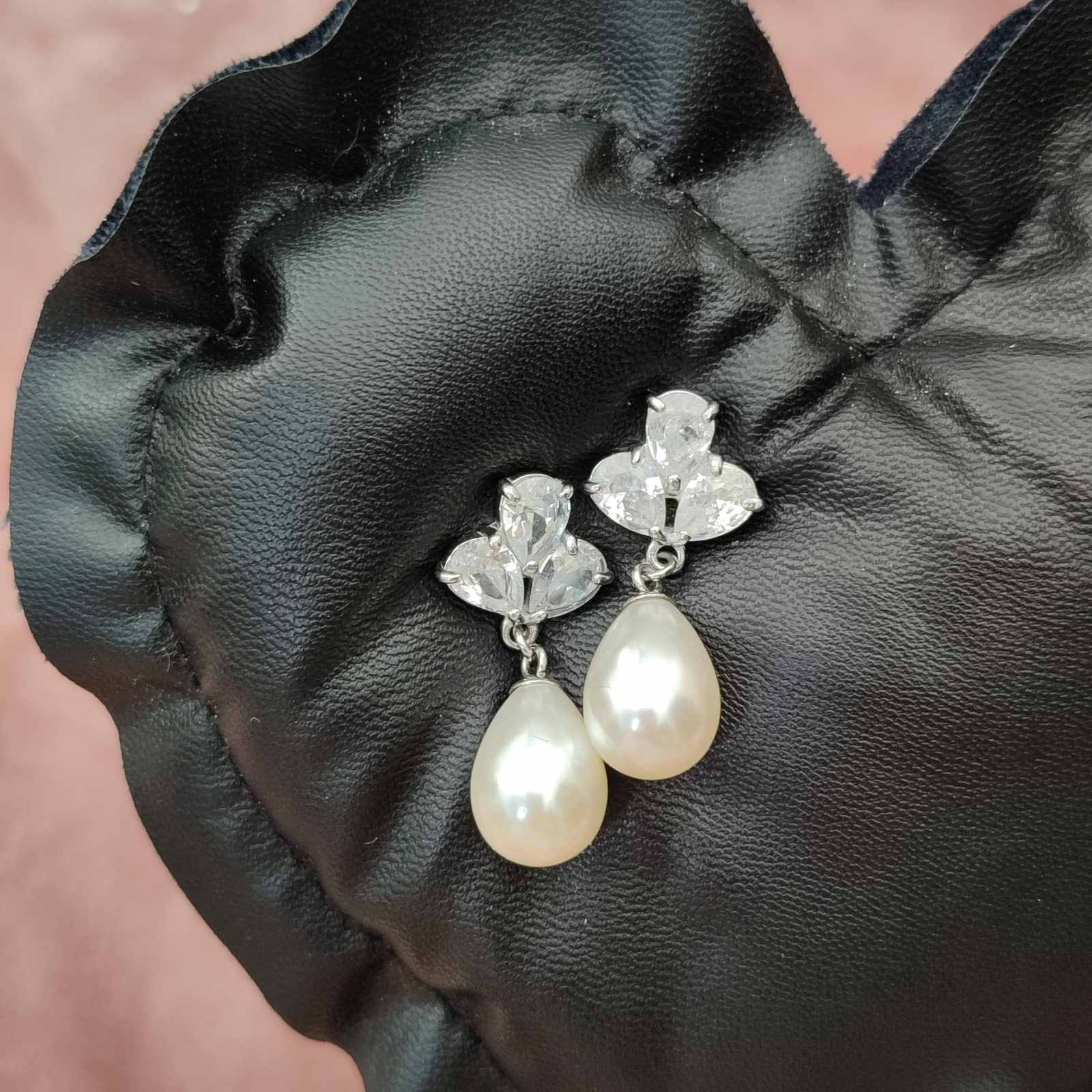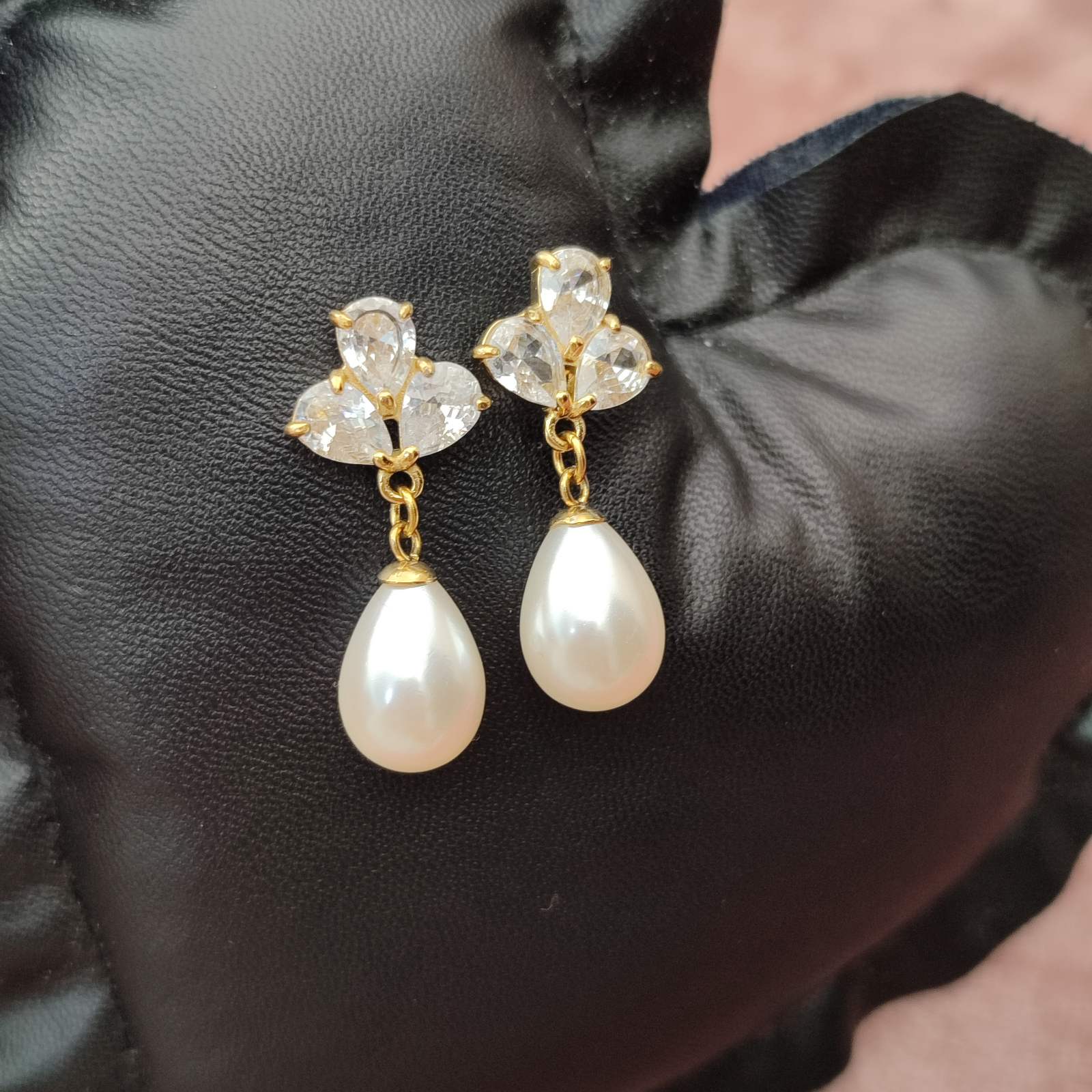Ατσάλινα σκουλαρίκια κρεμαστά με πέρλα και strass. Σε δυο χρωματα, χρυσο και ασημενιο.