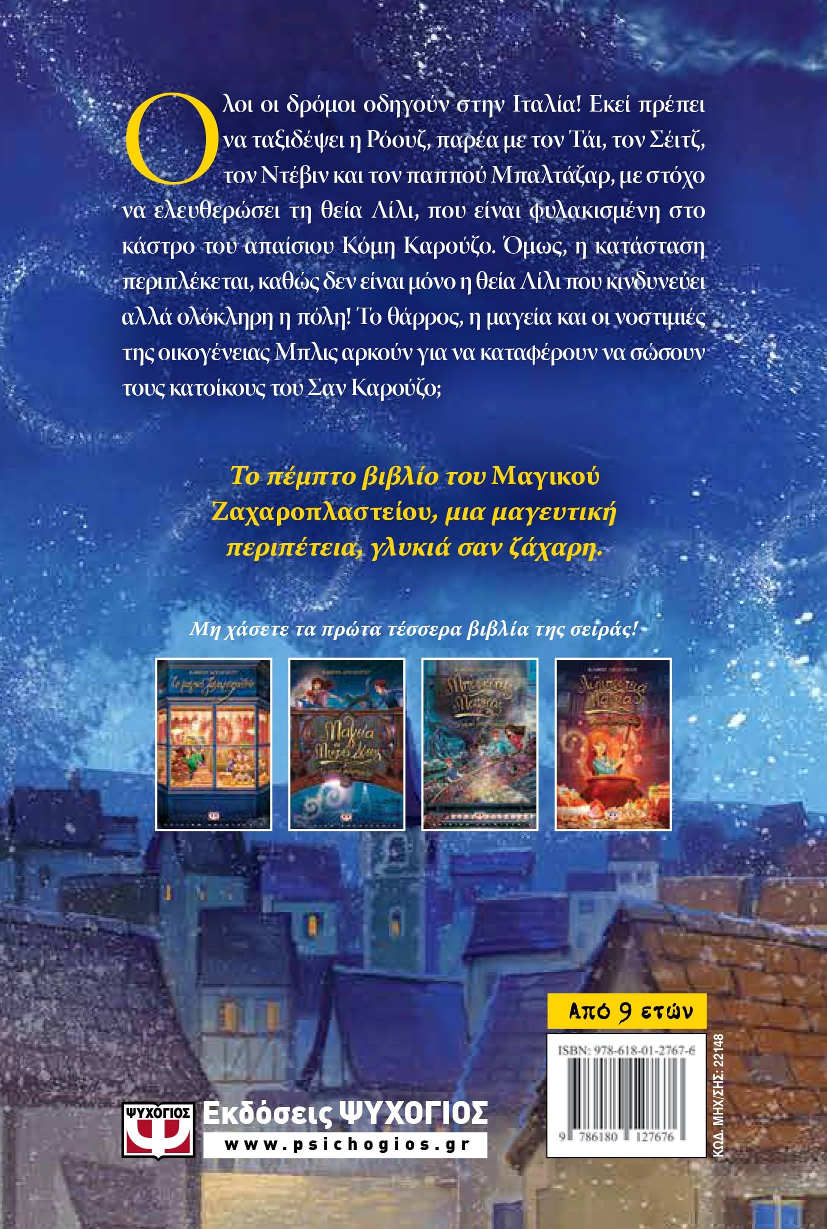 Όλοι οι δρόμοι οδηγούν στην Ιταλία! Εκεί πρέπει να ταξιδέψει η Ρόουζ, παρέα με τον Τάι, τον Σέιτζ, τον Ντέβιν και τον παππού Μπαλτάζαρ, με στόχο να ελευθερώσει τη θεία Λίλι, που είναι φυλακισμένη στο κάστρο του απαίσιου Κόμη Καρούζο. Όμως, η κατάσταση περιπλέκεται, καθώς δεν είναι μόνο η θεία Λίλι που κινδυνεύει αλλά ολόκληρη η πόλη! Το θάρρος, η μαγεία και οι νοστιμιές της οικογένειας Μπλις αρκούν για να καταφέρουν να σώσουν τους κατοίκους του Σαν Καρούζο; Το πέμπτο βιβλίο του Μαγικού Ζαχαροπλαστείου, μια μαγευτική περιπέτεια, γλυκιά σαν ζάχαρη.