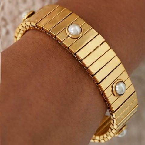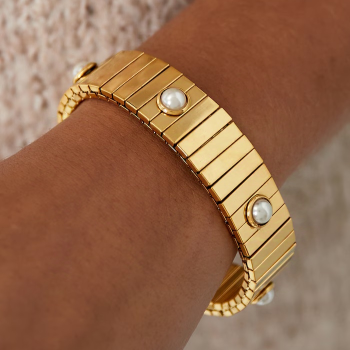Η χρυσή επιφάνεια του βραχιολιού αναδεικνύει τη φυσική λάμψη των πέρλων, δίνοντάς του μία απαλή και πολυτελή αίσθηση.
