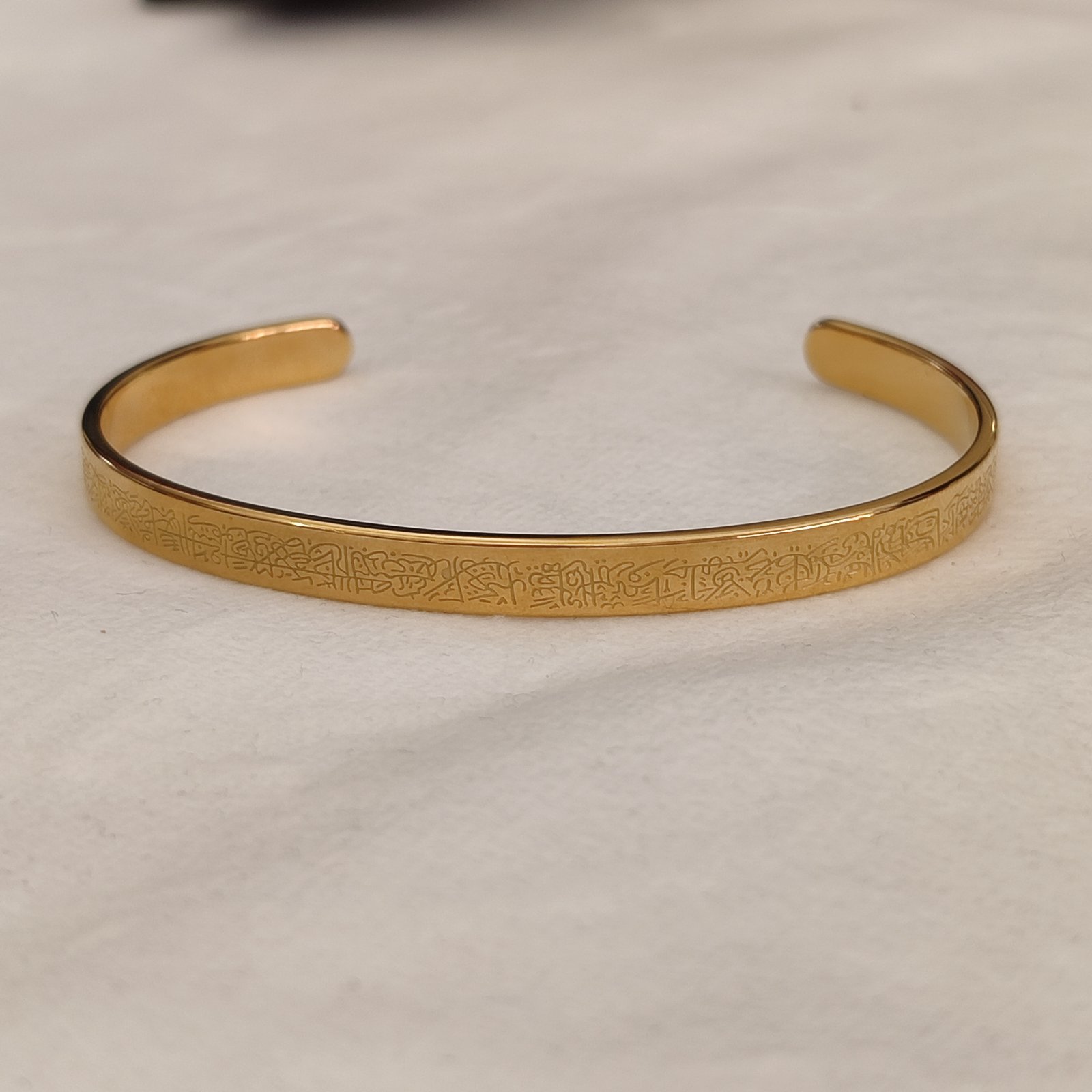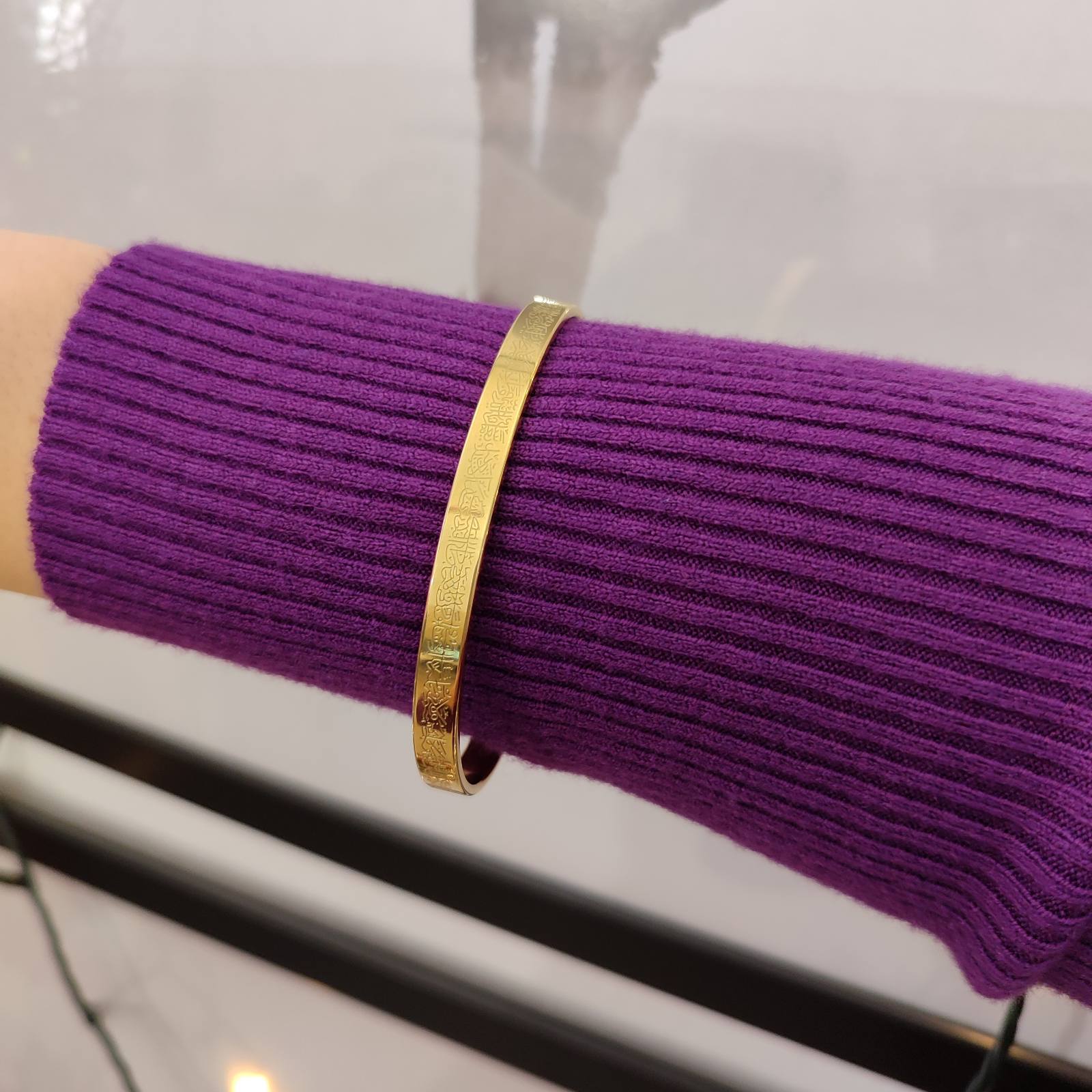 Η ατσάλινη λεπτή χειροπέδα με σκαλιστό σχέδιο σε χρυσή απόχρωση προσφέρει έναν συνδυασμό εκλεπτυσμένου στυλ και ανθεκτικότητας.